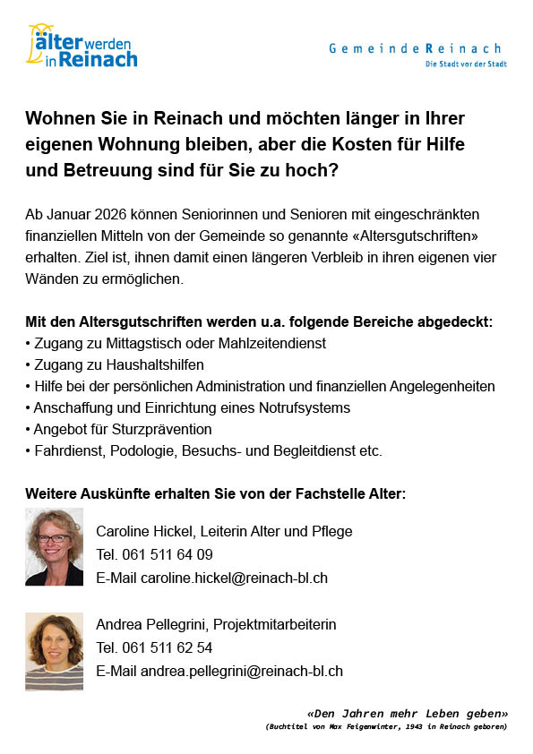> vernetzt die Dienstleistungsangebote der Gemeinde Reinach für Seniorinnen und Senioren