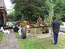 Zu einer grösseren Sache, die wesentlich länger dauerte wie die Ideensammlung, wurde dann die Instandsetzung und Renovation mit tatkräftiger Hilfe von Jugendlichen und grossem Einsatz des Teams. Die Aufbauten waren in so schlechtem Zustand, dass kurz nach Beginn der Erneuerungsarbeiten nur noch das nackte Chassis des Bauwagens dastand.