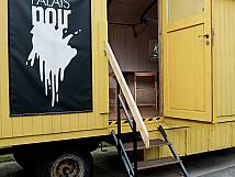 In schlechtem Zustand, aber immerhin noch ansatzweise fahrtüchtig, wurde er dem Jugendhaus angeboten. Dieses Geschenk konnte das Jugendhausteam auf keinen Fall ausschlagen. So ist das Palais noir im Jahr 2012 von einem auf den anderen Tag Besitzer dieses Wagens geworden. Ideen und Träume zur Nutzung eines solchen Wagens sprossen ununterbrochen. Eines war schnell klar: er sollte renoviert, umgebaut und möglichst vielseitig genutzt werden können. Nach einigen Gesprächen mit den Jugendlichen und im Team wurde klar: der Baustellenwagen sollte zu einem fahrbaren, vielseitig genutzten Mobil werden: für die Jugendlichen ein mobiles Jugendhaus, an Festbetrieben eine Buvette, für Vereine und Institutionen ein fahrbarer Treffpunkt, ein temporäres Büro.
