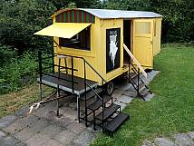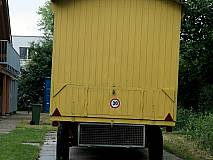 Der Bauwagen misst in der Länge 6,6 m (inklusive Deichsel 8,8 m) und in der Breite 2,3 m. Für die Treppen kommen seitlich noch mindestens 1,2 m zur Breite dazu (siehe Fotos!)
